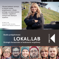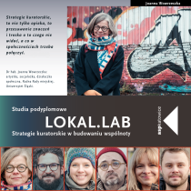 LOKAL.LAB | STRATEGIE KURATORSKIE W BUDOWANIU WSPÓLNOTY to interdyscyplinarne podyplomowe studia miejskie i kuratorskie. Adresowane są do osób działających w sektorze spraw społecznych, rozwoju miast, kultury i zajmujących się sztuką, tak w instytucjach jak i w działaniach pozainstytucjonalnych.