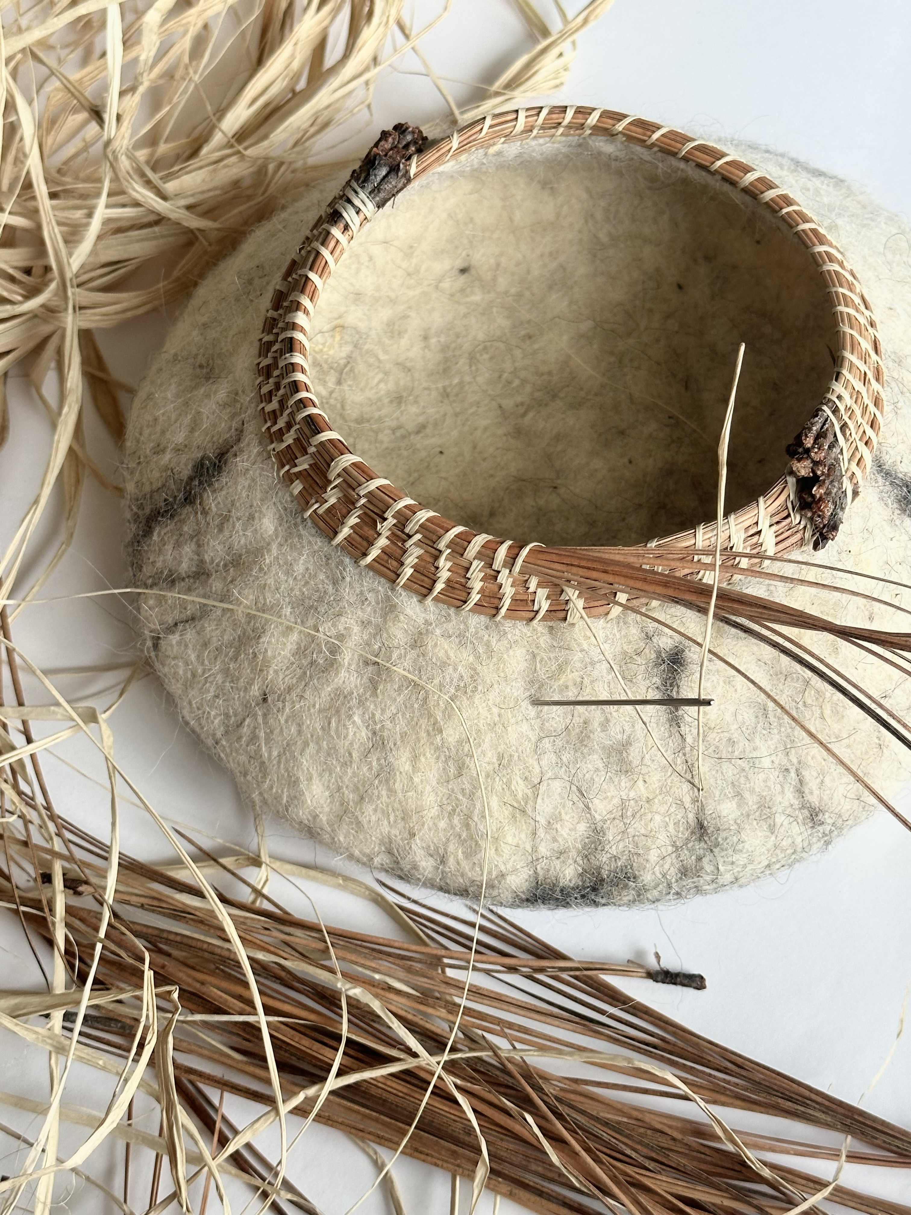 Obiekt łączący dwie odrębne techniki rzemieślnicze: plecionkarstwo i filcowanie. Prosta forma z filcu harmonijnie współgra z wyplecionym w technice spiralnej elementem z igieł sosny żółtej.