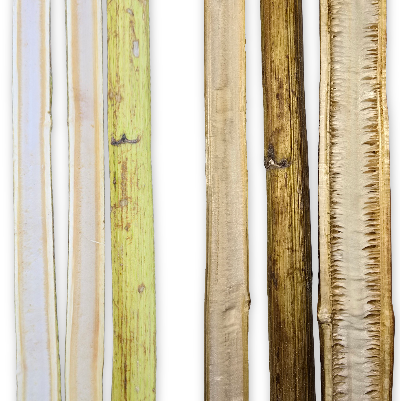 Próbki materiałowe – włókna pozyskane z liścia i „schabu” rogożynowego oraz nitka rogożynowo – woskowa powstała w wyniku skręcania włókien. Pałka wodna charakteryzuje się włóknistą budową łodygi, dlatego postanowiono sprawdzić możliwości włókiennicze surowca.